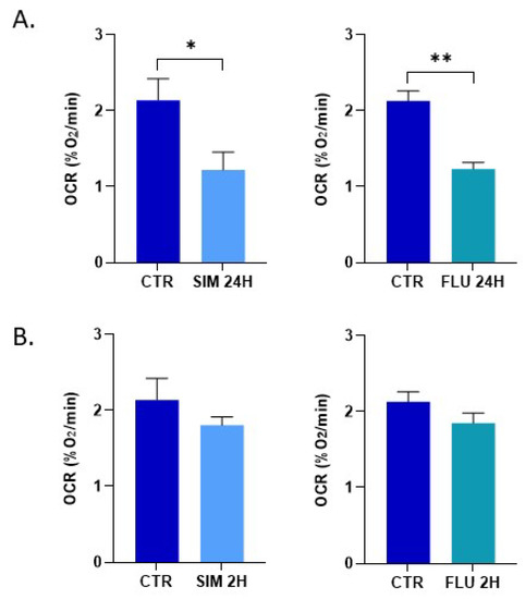 Figure 3. Impact of statins on the oxygen consumption rate (OCR) by prostate cancer cells as measured by EPR respirometry. (A) effect of a 24 h exposure to simvastatin and fluvastatin (10 μM) on the OCR of PC-3 cells; (B) effect of a 2 h exposure to simvastatin and fluvastatin (10 μM) on the OCR of PC-3 cells. Bars represent means ± SEM (% O2/min), (*) p < 0.05, (**) p < 0.01, Student’s t-test, n = 3.