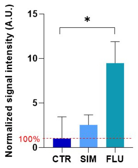 Figure 4. Impact of statins on the mitochondrial superoxide level of PC-3 cells exposed 24 h to simvastatin and fluvastatin (10 µM). Mitochondrial superoxide was measured using mitoTEMPO-H as an EPR sensor. Superoxide contribution to the signal was measured by making the difference between the signal intensities recorded in the absence and in the presence of PEGSOD2. Bars represent means ± SEM (A.U), (*) p < 0.05, one-way ANOVA, n = 3.