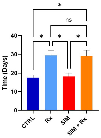 Figure 6. Effect of daily treatment with Simvastatin (20 mg/kg) delivered at the time of maximal tumor reoxygenation on PC-3 tumor growth. Data are shown as means ± SEM of tumor growth to achieve a 1200 mm3 tumor volume. (*) p < 0.05, two-way ANOVA n = 9/group.