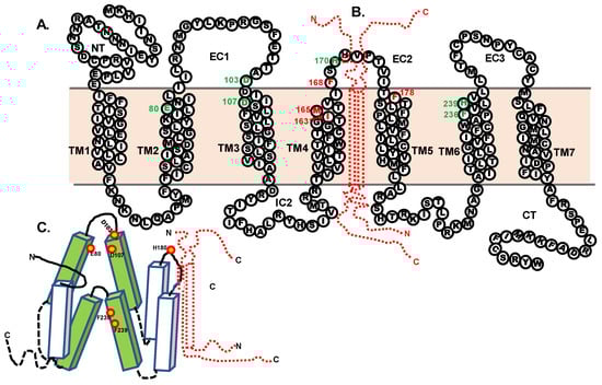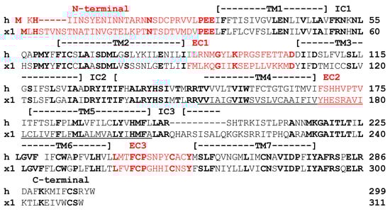 An alignment of the amino acid sequences of hMC2R and xtMc1r is shown in Figure 1. The hypothetical membrane topology of hMC2R was predicted using the TMHMM program from the DTU Bioinformatics Server (https://www.bioinformatics.dtu.dk, accessed on 29 October 2018), and the two receptor sequences could be aligned by inserted two gaps into the hMC2Rsequence. While the primary sequence identity of the two receptors was only 40%, identical amino acid motifs were apparent in all seven transmembrane domains and the three intracellular domains, with the highest primary sequence identity observed for IC2 (81%). However, the primary sequence identity in the extracellular domains was more variable (N-terminal 21%, EC1 16%, EC2 0%, EC3 43%).