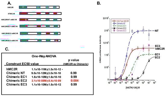 The EC1 chimeric receptor (hMC2R/EC1 xtMC1R) and the EC3 chimeric receptor (hMC2R/EC3 xtMC1R) both had EC50 values that were approximately 10-fold lower than the EC50 value for hMC2R (Figure 2B). However, the decline in ligand sensitivity for both chimeric receptors was not statistically different from the EC50 value for hMC2R (Figure 2C).