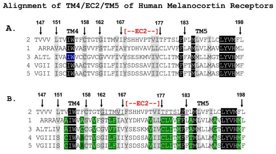 Alignment of Amino Acid Sequences of TM4/EC2/TM5 Domains of Human MCRs: Identity/Similarity Analysis. (A) The amino acid sequences of the TM4/EC2/TM5 domains for hMC2R (AA067714.1), hMC1R (Q01726.2), hMC3R (AKI72215.1), hMC4R (NP_005903.2), and hMC5R (NP_005904.1) were analyzed for primary sequence identity/biochemical similarity using BLOSUM (https://www.ncbi.nlm.nih.gov/Class/FieldGuide/BLOSUM62.txt, accessed on 16 August 2022). Positions that are heighted in black for all five receptors are identical. Positions that are similar for all five receptors are highlighted in grey. (B) The same analysis was done for only hMC1r, hMC3R, hMC4R, and hMC5R, and the positions that are identical or similar but not found in hMC2R are highlighted in green.