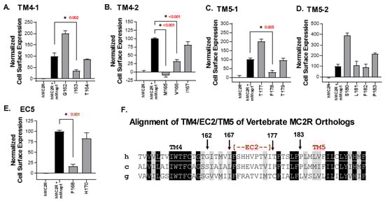 CHO cells were plated at 0.75 × 105 cells/well in a fibronectin-treated 24-well culture dish and grown overnight in in a 37 °C CO2 incubator. Cells were transfected with cDNAs encoding hMC2R-V5 alone (negative control), hMC2R-V5 + mMrap1 (positive control), or hMC2R-V5 alanine-substituted mutant constructs + mMrap1 using jetPRIME transfection reagents (Polyplus transfection, Illkirch, France) as described in Barney et al. [16]. After 48-h, cells were fixed in 4% Paraformaldehyde, washed and then incubated with polyclonal V5-epitope antibody (1:500 dilution; Genetex, Irvine, CA, USA) followed by secondary HRP-conjugated goat anti-rabbit antibody (1:500 dilution). Cells were washed and treated with one-step 2,2′azinobis-3ethylbenzthiazoline-6-sulfonic acid (one-step ABTS) (Thermo Fisher Scientific, Waltham, MA, USA). Aliquots of supernatant were transferred to a 96-well plate and absorbance at 405 nm was measured using a Bio-TEK Synergy HTX plate reader (Agilent Technologies, Santa Clara, CA, USA). The rationale for selecting residues in TM4 and TM4 for single-alanine substitution is based on the alignment in Figure 3. The data presented in Figure 4 are normalized to the positive (hMC2R+MRAP1) and negative (hMC2R alone) controls, such that the positive control equals 100% and the negative control equals 0%. The normalized data were analyzed using a one-way ANOVA with Tukey’s multi-comparison post-test using GraphPad Prism software (GraphPad Inc, La Jolla, CA, USA), and the threshold for significance was set at p < 0.05 (Figure 4), or using Student’s t-test (Figure S1B).