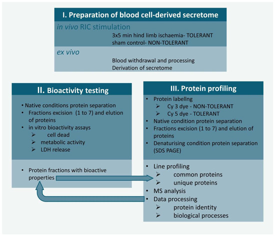 Figure 1 provides an overview of the experiments. (I) RIC stimulation/non-stimulation of rats via limb ischaemia was followed by the preparation of blood cell-derived secretomes drawn from RIC-treated (tolerant secretome) and non-treated animals (non-tolerant secretome). (II) Protein mixtures were separated with native polyacrylamide gel electrophoresis (PAGE) and partitioned into seven fractions. Proteins were passively eluted from the gel pieces, and the bioactivity of proteins was tested for each fraction. (III) Cy3- and Cy5-labelled proteins were separated into the tolerant/non-tolerant secretome with native PAGE and then partitioned into seven fractions. Proteins were passively eluted from gel pieces. Proteins were subjected to semiquantitative analysis of uniquely secreted proteins and/or changes in common protein contents, followed by mass spectrometric (MS) analysis of proteins related to bioactive fractions.