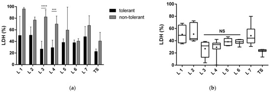 Lactate dehydrogenase (LDH) released by neurons after exposure to 200 µM glutamate and co-cultivation with the total tolerant or non-tolerant secretomes or their fractions. Protein fractions 1–7 of the total secretomes were separated with native polyacrylamide gel electrophoresis. The LDH content is expressed as a percentage of neurons exposed to 200 µM glutamate. The tests were performed after 24 h of incubation in four replicates of three cultivations. (a) Comparison of the neuroprotective effect of tolerant versus non-tolerant secretomes and their respective fractions. The data are presented as the mean ± standard deviation (*** p < 0.001; **** p <0.0001). (b) Comparison of the neuroprotective effect of the fractions of the tolerant secretome to the total secretome. The graph shows the minimum to the maximum values with the median bar; + indicates the mean. NS, nonsignificant changes in the LDH content, compared with the total secretome; TS, total secretome.