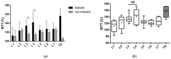 The number of dead cells exposed to 200 µM glutamate and co-cultivated with the total tolerant or non-tolerant secretomes and protein fractions of the total secretomes. Protein fractions (1–7) were separated with native polyacrylamide gel electrophoresis. The number of PI-positive cells is expressed as a percentage of the total number of cells. The tests were performed after 24 h of incubation in four replicates of three cultivations. (a) Comparison of the neuroprotective effect of the tolerant versus non-tolerant secretomes and their respective fractions. The data are presented as the mean ± standard deviation (** p < 0.01). (b) Comparison of the neuroprotective effects of the individual fractions of the tolerant secretome to the total secretome. The graph presents the minimum to the maximum values with the median bar; + indicates the mean. NS, nonsignificant changes in the dead cell count, compared with the total secretome; TS, total secretome.