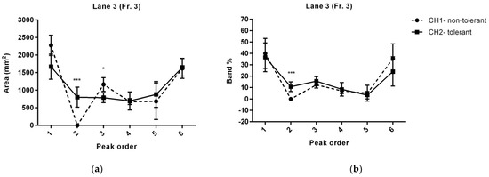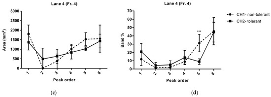Lane profiles of protein peaks from fractions 3 and 4 after separation with sodium dodecyl sulphate–polyacrylamide gel electrophoresis. (a) Peak area (mm2) and (b) percentage of the total area of the peaks in the lane (band %) of proteins derived from fractions 3 of tolerant (CH1) and non-tolerant (CH2) secretomes. (c) Peak area (mm2) and (d) percentage of the total area of the peaks in the lane (band %) of proteins derived from fractions 4 of tolerant (CH1) and non-tolerant (CH2) secretomes. The data are presented as the mean ± standard deviation (* p < 0.05; *** p <0.001). Fr., protein fraction separated by native polyacrylamide gel electrophoresis; CH, fluorescence channel of tolerant/non-tolerant proteins.