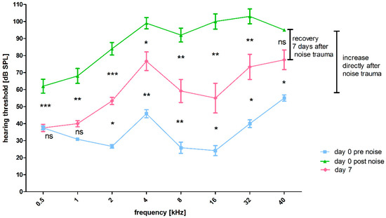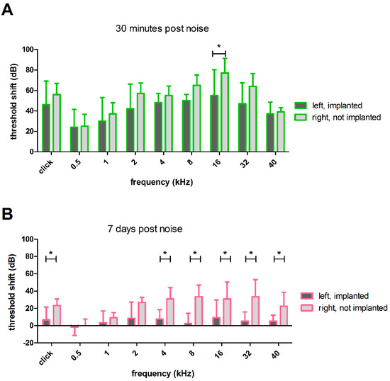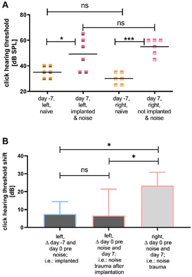 - Lin, H.W.; Furman, A.C.; Kujawa, S.G.; Liberman, M.C. Primary Neural Degeneration in the Guinea Pig Cochlea after Reversible Noise-Induced Threshold Shift. JARO-J. Assoc. Res. Otolaryngol. 2011, 12, 605–616. [Google Scholar] [CrossRef] [PubMed]