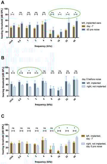 3.2.2. Effect of HDD Implantation on Frequency-Specific ABR Thresholds