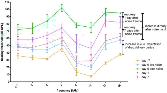 Malfeld, K.; Baumhoff, P.; Volk, H.A.; Lenarz, T.; Scheper, V. Local Long-Term Inner Ear Drug Delivery in Normal Hearing Guinea Pig—An Animal Model to Develop Preventive Treatment for Noise-Induced Hearing Loss. Biomolecules 2022, 12, 1427. https://doi.org/10.3390/biom12101427