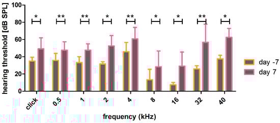- Shuster, B.; Casserly, R.; Lipford, E.; Olszewski, R.; Milon, B.; Viechweg, S.; Davidson, K.; Enoch, J.; McMurray, M.; Rutherford, M.A.; et al. Estradiol Protects against Noise-Induced Hearing Loss and Modulates Auditory Physiology in Female Mice. Int. J. Mol. Sci. 2021, 22, 12208. [Google Scholar] [CrossRef] [PubMed]