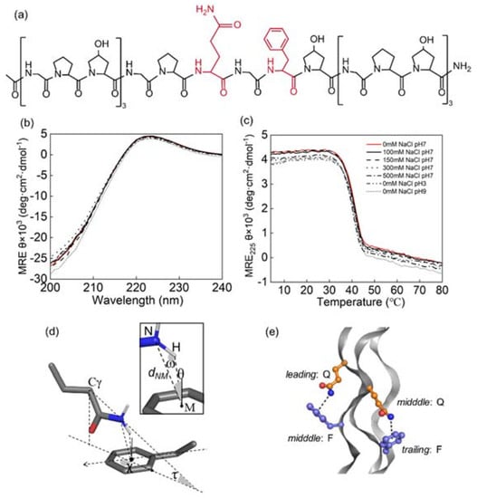 In a previous study of GPQGFO peptides, it was indicated that a favorable Q–F interaction could be generated to stabilize the triple helix in a neutral environment []. To experimentally assess the tolerance of the Q-F pairs in different environments, the thermal stability of GPQGFO under various NaCl (100–500 mM) concentrations and pH (3, 7, 9) was characterized by circular dichroism spectra. The molar residual ellipticity (MRE) at 220 nm and Tm (~40°C) were apparently unaffected (Figure 1b,c). These results indicated that the stability contribution of the Q-F pairs was maintained under various environmental conditions, which distinguished the GPQGFO motif from that of less tolerant motifs such as GPKGEO where the stabilizing electrostatic interactions are more affected []. Notably, the Tm values of peptides recorded here were higher than those reported by Persikov et al. [] and Walker et al. [], potentially due to differences in melting schedule, host sequence, or blocking of peptide termini.