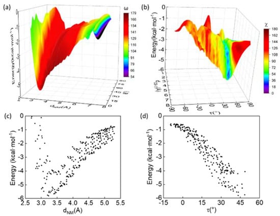 (a) Three-dimensional (3D) interaction energy (ΔE) surface is plotted against dNM and θ. The energy surface is color-coded with ω. The color scales are located on the right. (b) 3D ΔE surface is plotted against dCγ-π and τ. The energy surface is color-coded with χ. The color scales are located on the right. (c) The data points with 0 < θ < 20° in the 3D-plot in (a) are projected on the ΔE-dNM plane. (d) The data points with 40° < χ < 50° in the 3D-plot in (b) are projected on the ΔE-τ plane.