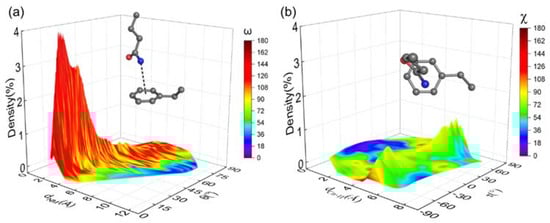 Molecular dynamics simulation of the collagen-like peptide GPQGFO. The geometric parameters of the Q-F pair between the leading and middle chain were extracted from the trajectory and plotted into three-dimensional density maps. (a) Conformation occurring percentage is plotted against dNM and θ. The surface is color-coded with ω. (b) Conformation occurring percentage is plotted against dCγ-π and τ. The surface is color-coded with χ. The color scales are located on the right. Insets of (a,b) show the most occurring conformations.