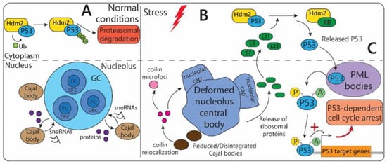 One of the most prominent mechanisms of nucleolus-dependent regulation of stress response is associated with stabilization and activation of “genome guardian” tumor suppressor p53 (Figure 2B) []. Under normal conditions, the p53 function is blocked by inhibitory binding of E3 ubiquitin ligase Hdm2 (also called Mdm2 in mice), which interacts with the p53 transcription activation domain, preventing it from inducing its target genes. Moreover, Hdm2 shuttles p53 from the nucleus to the cytoplasm, a process facilitated by the export of ribosomal subunits [], where ubiquitinylated p53 can be degraded by the proteasome. In either case of nucleolar segregation or fragmentation triggered by stress, aberrant expression and re-localization of many ribosomal proteins (RBs) are observed. These alterations in ribosome biogenesis initialize p53-dependent cell cycle arrest via several different mechanisms: (1) p53 release from the complex with Hdm2 (Figure 2B); (2) enhancement of the p53 translational profile; and (3) inhibition of co-ribosomal export of p53-Hdm2. The first mechanism is underliedby the competition between p53 and released from the nucleolus RBs for Hdm2 binding, leading to the recession of p53 proteasomal degradation. For example, under ribosomal stress, liberated ribosomal proteins (such as L5, L11, L23, and S7) directly interact with Hdm2 blocking its association with p53 (Figure 2B) [,]. Then, the elevation of active p53 levels under stress conditions is also facilitated by its increased translation. For instance, under genotoxic stress, the released L26 from the 60S ribosomal subunit ribosomal protein binds to the 5’ untranslated region of p53 mRNA and upregulates its translation []. Under normal conditions, the association of L26 with p53 mRNA is additionally repressed by Mdm2-induced polyubiquitylation and proteasomal degradation of L26. However, under genotoxic stress, this process is inhibited []. Finally, the last described pathway involves inhibition of p53/Hdm2 co-export with ribosomal subunits from the nucleolus to the cytoplasm where p53 proteasomal degradation occurs [].