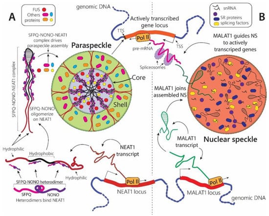 Interestingly, the core RNA of paraspeckles NEAT1 is positioned in the genomic environment of MALAT1 and two RNAs are transcribed from the adjacent regions in the genome [] (Figure 1B,C and Figure 3A,B). Despite that, these RNAs partition to different MLOs and never colocalize to the same condensate. On the other hand, the nuclear speckles and paraspeckles has been found to localize together at hundreds of active gene loci, however, primarily bound to distinct parts of the genes: NEAT1 was found at transcriptional start sites (TSS) and transcriptional termination sites (TTS), whereas MALAT1 primarily localized across gene bodies [] (Figure 3A,B). This might indicate a cooperation between these two biological condensates in the upregulation of gene expression. It is not yet clear if this mutually functional complementarity is maintained during the stress condition.
