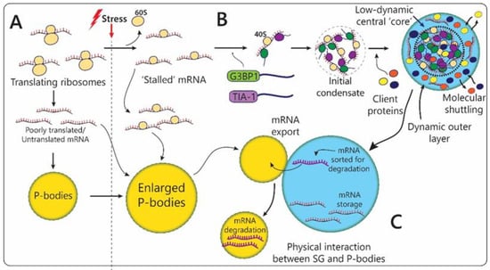 There is strong evidence for functional interplay and cooperation between stress granules and P-bodies (Figure 1H,I and Figure 4C). Two MLOs have been found to share some of the protein and mRNA content, while also having molecules uniquely attributed to one or another. The proteomic analysis showed that the protein composition of stress granules and P-bodies overlaps by 10–25% []. Moreover, the composition of stress-induced P-bodies resembles stress granules to an even greater extent []. Both SG and P-bodies contain components of the RNA-induced silencing complex (RISC), microRNAs, and argonaute proteins that are needed for RNA interference-induced silencing of mRNA. Additionally, both organelles include RNA-editing enzymes with antiviral activity, such as APOBEC3G (apolipoprotein B mRNA-editing enzyme catalytic subunit 3G) []. The presence of so many various catalytically active complexes suggests that these MLOs are the centers for post-transcriptional regulation of gene expression.
