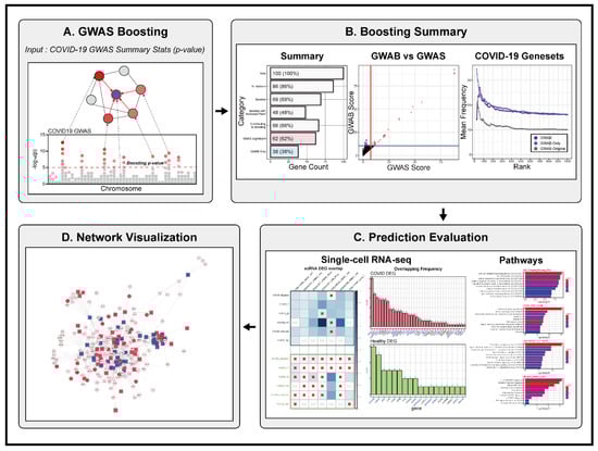 Here, we present COVID-GWAB (https://inetbio.org/covidgwab/ (accessed on 2 September 2022)), a web-based tool for boosting the original GWAS signals of individual genes for COVID-19 by integrating those of their interactome neighbors and comparing the results with various other datasets and literature sources. COVID-GWAB provides simple step-by-step web interfaces that can initiate network-based boosting of the GWAS data, understand the boosted results and provide a summary, and further validate and discover additional resources. With COVID-GWAB, researchers can find new COVID-19-related candidate genes with GWAS data.