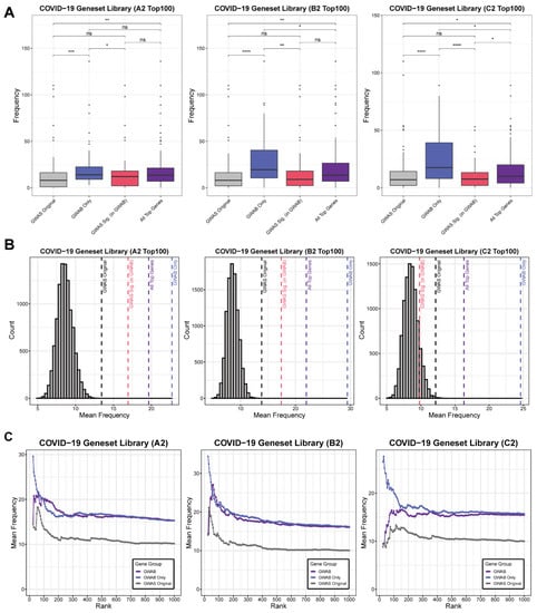 Frequency of appearance in COVID-19 gene set library. Release 6 of COVID-19 HGI GWAS data; A2, B2, and C2 are used. GWAS Originals are top GWAS results based on GWAS statistics p values without boosting. GWAB Onlys are genes in GWAB Top N results (ranked with GWAB scores) that have GWAS statistics p values bigger (not significant) than 5 × 10−8. GWAS Sigs are genes in GWAB Top N results with GWAS statistics p values smaller (significant) than 5 × 10−8. All Top Genes are genes in GWAB Top N results. (A) Comparison of frequencies of GWAB top 100 genes for each gene group. The Wilcoxon signed-rank test is used for the p values. Statistical significance: ns (p > 0.05), * (p ≤ 0.05), ** (p ≤ 0.01), *** (p ≤ 0.001), **** (p ≤ 0.0001) (B) Histogram with mean COVID-19 geneset library frequencies of 100 random genes from all genes, repeated 10,000 times. Each dashed line indicates the mean frequency of each gene group. (C) Mean frequencies of top-ranked genes from each gene group ranked from 25 to 1000 (increased by 5).