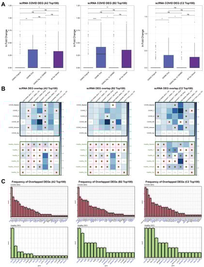 Overlaps of differentially expressed genes (DEGs) between COVID patients and healthy controls for each cell type from single-cell RNA-seq datasets. (A) Comparison of fold changes of GWAB top 100 genes for each gene group. The Wilcoxon signed-rank test is used for the p values. Statistical significance: ns (p > 0.05), * (p ≤ 0.05), ** (p ≤ 0.01), **** (p ≤ 0.0001). (B) Overlaps between DEGs and GWAB top 100 genes. The color scale indicates the overlap percentage, a red × indicates no significant overlap for the corresponding categories (p > 0.05, Fisher’s exact test), and NA indicates no available DEGs for the corresponding categories. (C) Overlap counts for COVID DEGs and control DEGs. The genes in blue are the ‘GWAB Only’ genes.