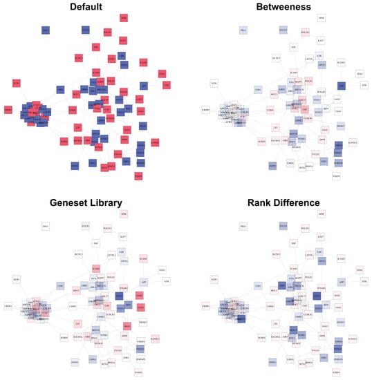 Network visualization of top 100 GWAB-COVID results with B2 of HGI GWAS Release 6. Only genes included in HumanNet are included in this network. Adjacent genes that are visualized in the web server are excluded here for simplification. For the “Default” network graph, the blue nodes are the newly discovered genes that are not GWAS-significant. The red nodes are the GWAS significant genes. For the rest of the network graphs, the nodes have more transparency with lower ranks based on their betweenness centrality, COVID-19 geneset library frequency, and rank changes from GWAS alone to COVID-GWAB.