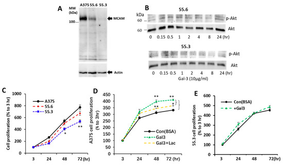 MCAM shRNA suppression inhibits AKT activation and proliferation of melanoma cells in response to galectin-3. (A) Generation of two subclones (55.6 and 55.3) of MCAM suppressed A375 cells with shRNA (A). (B) MCAM suppression reduces AKT activation in A375 cell in response to galectin-3. Moderately MCAM-suppressed (55.6) and highly MCAM-supressed (55.3) subclones of A375 cells were treated with 10 µg/mL galectin-3 for different time before the cells were lysed and levels of p-AKT and AKT were determined by immunoblotting. Representative blots from two independent analyses are shown. (C–E) Galectin-3–MCAM interaction increases melanoma cell proliferation. Proliferation of parental or MCAM suppressed A375 cells was analysed in the absence (C) or presence of Gal-3 (D,E) or lactose (D). Data are presented as mean ± SEM from three independent experiments, each in triplicate. * p < 0.05, ** p < 0.01.