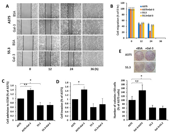 Galectin-3–MCAM interaction promotes melanoma cell adhesion, migration, invasion, and colony formation. (A) MCAM–galectin-3 interaction increases melanoma cell migration. Gaps of A375 and 55.3 cell monolayer were created by silicone inserts and imaged every 12 h in the presence of 10 µg/mL galectin-3 or BSA (control). Representative images are shown in (A), and percentage of the gaps in comparison with that at 0 h from two independent experiments are shown in (B). Gap of A375 cells treated with galectin-3 is 51% smaller than that of A375 cells without galectin after 24 h. (C,D) Galectin-3–MCAM interaction promotes melanoma cell adhesion to and invasion through Matrix proteins. A375 and 55.3 cell adhesion to or invasion through matrix proteins in the presence or absence of 10 µg/mL galectin-3 was assessed. (E) MCAM–galectin-3 interaction enhances melanoma colony formation. Number of colonies (>50 cells) after 10-day culture in the presence of 10 µg/mL galectin-3 or BSA were quantified. Data are presented as mean ± SEM of at least three independent experiments, each in triplicate. * p < 0.05, ** p < 0.01.