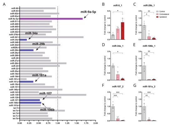 To confirm these results, we then performed qPCR for a selection of miRNAs that were related to AD pathology [33] and that had shown a fold change between 0.2–1.7 when comparing the ipsilateral with the contralateral side. qPCR was performed in cortical extracts from the ipsilateral and contralateral sides of the same CCI rats and compared to the values of those obtained from naïve rats as controls (Figure 1B–G).