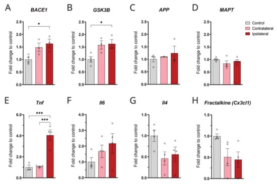 mRNAs levels of genes associated with AD and neuroinflammation are dysregulated in the cortex of the CCI rat model. mRNA expression analysis was carried out in rat CCI brains, comparing the ipsilateral and contralateral sides with naïve rat brains (n = 4 per group). (A) Quantification of BACE1 (one-way ANOVA F = 5.901 p = 0.0315); (B) GSK3β (one-way ANOVA F = 6.138 p = 0.0289); (C) APP (one-way ANOVA F = 0.5521 p = 0.5989); (D) MAPT (one-way ANOVA F = 1.137 p = 0.3629); (E) Tnf (one-way ANOVA F = 27.65 p = 0.0003); (F) Il-6 (one-way ANOVA F = 1.648 p = 0.2455); (G) Il-4 (one-way ANOVA F = 3.366 p = 0.0810); (H) Cx3cl1 (Fractalkine) (one-way ANOVA F = 3.620 p = 0.0702) mRNAs. Values shown in graphs represent the mean value ± SEM and are expressed as fold change of naïve control rats. Statistical analysis included one-way ANOVA (Tukey’s multiple comparisons test) * p < 0.05, and *** p < 0.001.
