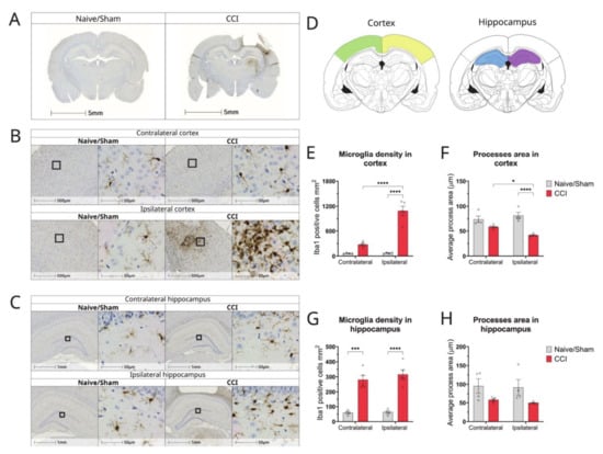 Changes in microglial density, morphology, and distribution in cortex and hippocampus of CCI rat brains 2 weeks post-injury. (A) Representative whole brain photomicrographs of Iba1 + staining in naïve/control and CCI rat brains; (B) Magnified representative images of the cortex of naïve/sham animals and CCI brains from ipsilateral and contralateral sides of the injury; (C) Magnified representative images of the hippocampus of naïve/sham animals and CCI brains from ipsilateral and contralateral sides of the injury; (D) Brain atlas images, showing areas of cortex and hippocampus analysed; (E) Quantification of the microglia count/mm2 by Iba1 staining in the cortex of CCI and sham/naïve control rats (2-way ANOVA hemisphere F(1,14) = 38.65 p < 0.0001, injury F(1,14) = 86.36 p < 0.0001, interaction F(1,14) = 37.63 p < 0.0001); (F) Average process area per microglia in cortex of CCI and naïve/sham rats (2-way ANOVA hemisphere F(1,14) = 1.129 p = 0.3060, injury F(1,14) = 44.53 p < 0.0001, interaction F(1,14) = 8.569 p = 0.0110); (G) Quantification of the microglia count/mm2 in the hippocampus of CCI and sham/naïve control rats (2-way ANOVA hemisphere F(1,14) = 0.631 p = 0.4402, injury F(1,14) = 9 3.32 p < 0.0001, interaction F(1,14) = 0.409 p = 0.5324); (H) Average process area per microglia in hippocampus of CCI and naïve/sham rats (2-way ANOVA hemisphere F(1,14) = 0.234 p = 0.6357, injury F(1,14) = 9.955 p = 0.0070, interaction F(1,14) = 0.036 p = 0.8522);. All data are presented as mean ± SEM, n = 4–5 per group. Two-way ANOVA, * p < 0.05, *** p < 0.001; **** p < 0.0001. Mouse brain atlas images were obtained from the Allen Institute website (www.alleninstitute.org, accessed on 29 September 2022).