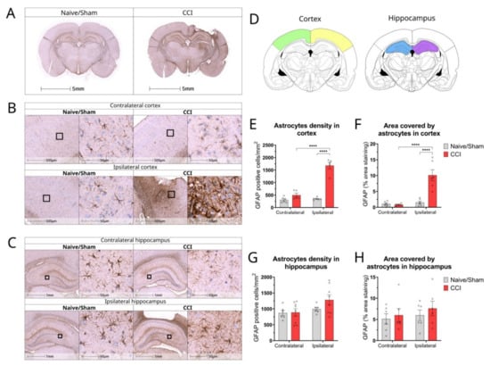 Changes in astrocyte density, morphology and distribution in cortex and hippocampus of CCI rat brains 2 weeks post-injury. (A) Representative whole brain photomicrographs of GFAP+ staining in naïve/control and CCI rat brains; (B) Magnified representative images of GFAP staining in cortex of naïve/sham animals and CCI brains from ipsilateral and contralateral sides of the injury; (C) Magnified representative images of GFAP staining in the hippocampus of naïve/sham animals and CCI brains from ipsilateral and contralateral sides of the injury; (D) Brain atlas images, showing areas of cortex and hippocampus analysed; (E) Quantification of the GFAP+ cell count/ mm2 in the cortex of CCI and sham/naïve control rats (2-way ANOVA hemisphere F(1,18) = 67.93 p < 0.0001, injury F(1,18) = 104.8 p < 0.0001, interaction F(1,18) = 58.42 p < 0.0001); (F) Quantification of GFAP percentage area covered in the cortex of CCI and sham/naïve control rats (2-way ANOVA hemisphere F(1,19) = 25.57 p < 0.0001, injury F(1,19) = 18.95 p = 0.0003, interaction F(1,19) = 20.88 p = 0.0002); (G) Quantification of the GFAP+ astrocytes count/mm2 in the hippocampus of CCI and sham/naïve control rat (2-way ANOVA hemisphere F(1,24) = 4.515 p = 0.0441, injury F(1,24) = 1.590 p = 0.2194, interaction F(1,24) = 1.259 p = 0.2730); (H) Quantification of GFAP percentage area covered in the hippocampus of CCI and sham/naïve control rats (2-way ANOVA hemisphere F(1,20) = 0.719 p = 0.4063, injury F(1,20) = 0.736 p = 0.4009, interaction F(1,20) = 0.061 p = 0.8071). All data are presented as mean ± SEM, n = 5–8 per group. Two-way ANOVA, **** p < 0.0001. Mouse brain atlas images were obtained from the Allen Institute website (www.alleninstitute.org, accessed on 29 September 2022).