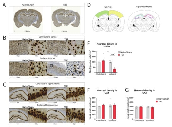 We next determined the consequences of TBI on neuronal loss 2 weeks post-injury, whereby neuronal death occurs either as a consequence of the mechanical forces of the injury or as result of secondary processes. Immunohistochemical staining using the neuron-specific nuclear protein NeuN revealed a characteristic pattern of healthy neurons showing round or oval morphology, while necrotic or apoptotic neurons within the injured tissue appeared small and irregularly shaped (Figure 5B).
