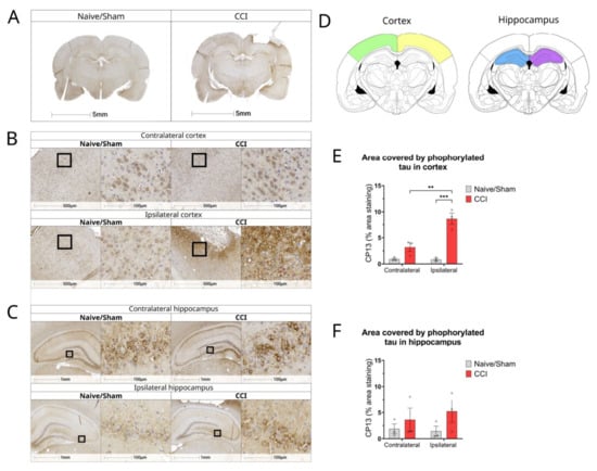 The effect of moderate TBI on the phosphorylation of tau protein was analysed by immunostaining with CP13 antibody, which specifically detects tau proteins with phosphorylation epitope around phospho-serine 202. An increase in CP13 staining was observed in the ipsilateral side of the cortex of the CCI rats compared with naïve (p = 0.0002) and the contralateral side (p = 0.0026) (Figure 6A,B,E). No significant changes were detected in the hippocampus (Figure 6C,F).
