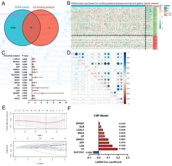Construction of the Cu−binding proteins (CBP) signature. (A) The Venn plot of the human copper proteome and the mRNA expression profile from the TCGA cohort. (B) Differentially expressed CBP between GC and normal tissues from the TCGA cohort. (C) The univariate Cox analysis found 16 prognostic CBP in GC cases. (D) The linear correlation analysis among 16 prognostic CBP in GC. (E) The most robust predictive genes were identified using the least absolute shrinkage and selection operator Cox regression algorithm. (F) An ensemble of 10 genes remained with non-zero coefficients.