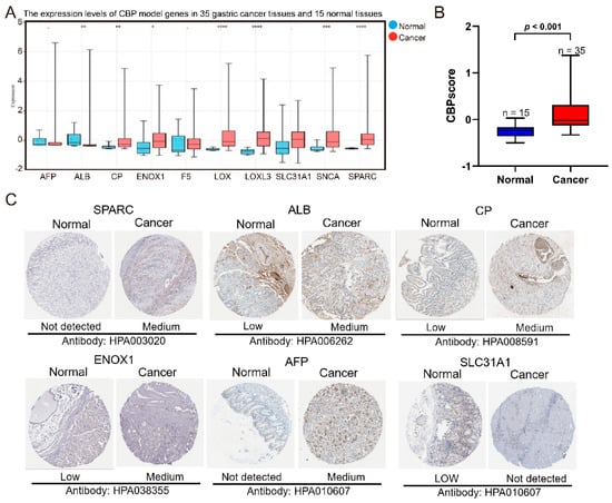To evaluate the expression levels of the 10 CBP genes (LOX, CP, F5, SPARC, LOXL3, ALB, AFP, ENOX1, SLC31A1 and SNCA) between the adjacent normal and GC tissues, we analyzed their mRNA expression levels in 15 normal and 35 GC tissues from our previous study []. The results showed that seven of the ten CBP genes were differentially expressed in normal and cancerous gastric tissues, and six genes were upregulated in GC tissues (Figure 2A). Moreover, the calculated CBPscores were significantly higher in GC tissues (Figure 2B). Then, immunohistochemical staining images from the HPA database (https://www.proteinatlas.org/) were downloaded to further confirm the expressed differences in protein expression levels. SPARC, ALB, CP, ENOX1 and AFP were highly expressed in the GC tissues compared to the adjacent normal tissues, while SLC31A1 was lower (Figure 2C). However, the expression levels of SNCA and LOXL3 were not different in GC and adjacent normal gastric tissues, and LOX and F5 were not available. These results confirmed that the ten CBP signature genes are associated with GC progression.