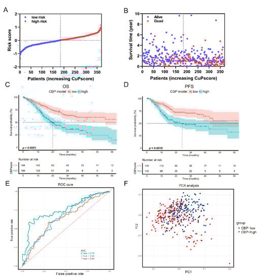 To investigate the prognostic value of the CBP signature, we first analyzed the relationship between CBPscores and survival status in the TCGA cohort. As depicted in Figure 3A,B, a higher score of the CBP signature predicted poor survival. The median value was used as the cut-off point to enhance the randomness and accuracy. The Kaplan–Meier curve analyses revealed that patients with higher CBPscores had poor OS and PFS (Figure 3C,D). Furthermore, a time-dependent ROC analysis was performed to evaluate the predictive ability of the CBP signature for GC patients’ survival. The area under the curve (AUC) at 1-, 3- and 5-year OS were 0.64, 0.66 and 0.75, respectively (Figure 3E). Furthermore, PCA analysis was performed to descript the different distributions of CBP signature genes between low- and high-CBP groups. The results showed that patients in the two groups had different distribution patterns (Figure 3F).
