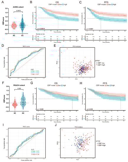 Validation of the CBP signature in the ACRG and PUKCH sets. (A) The scores of CBP signature in normal and GC tissues form the ACRG cohort. (B,C) Kaplan–Meier curves for the OS and PFS of GC patients in the CBP_low group and CBP_high group from the ACRG cohort. (D) AUC of time-dependent ROC curves at 1, 3 and 5 years in the ACRG cohort. (E) PCA analysis in the CBP_low group and CBP_high group from the ACRG cohort. (F) The scores of CBP signature in normal and GC tissues form the PKUCH cohort. (G,H) Kaplan–Meier curves for the OS and PFS of GC patients in the CBP_low group and CBP_high group from the PKUCH cohort. (I) AUC of time-dependent ROC curves at 1, 3 and 5 years in the PKUCH cohort. (J) PCA analysis in the CBP_low group and CBP_high group from the from the PKUCH cohort.