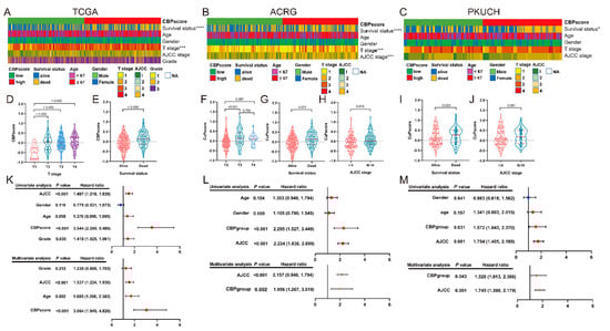 Relationships between the CBP signature and clinicopathological characteristics. (A–C) Heatmap of the clinicopathological characteristics and the scores of CBP signature; (D–J) the scores of CBP signature in different groups classified by clinical characteristics from the TCGA, ACRG and PKUCH sets. (K–M) Univariate and multivariate Cox regression analyses regarding OS in the TCGA, ACRG and PKUCH sets. * p < 0.05, *** p < 0.001, **** p < 0.0001.
