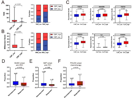 Recently, immunotherapy based on inhibitors to immune checkpoints has been well-developed and greatly improved the prognosis of patients with GC. Recent studies revealed that tumor mutation burden (TMB) and microsatellite instability (MSI) are important factors related to response to immunotherapy in cancer [,]. Then, we investigated the association between CBPscores, TMB and MSI in TCGA and ACRG cohorts. The results showed that CBPscores were negatively associated with TMB and MSI (Figure 7A,B) in the TCGA cohort. Consistent with the above results, the MSI subtype in ACRG classification also had low CBPscores compared to MSS/EMT, MSS/TP53- and MSS/TP53+ types (Figure 7C). Collective, patients with low CBPscores had a higher level of TMB/MSI, which indicated they responded well to immunotherapy. Then, a GC cohort with 45 patients treated with PD-1 blockade was used to investigate the relationship between the CBP signature and therapeutic response. The results showed that responders to PD-1 blockade had lower CBPscores (Figure 7D). Due to the lack of RNA data in GC cases with immunotherapy, we evaluate this relationship in a urothelial cancer cohort (n = 65), while patients who received chemotherapy were eliminated. The results also showed that patients in the low CBP group had a good response to PD-1 blockade monotherapy (Figure 7E). In addition, responders to neoadjuvant chemotherapy of a PKUCH cohort (n = 35) had higher CBPscores compared to non-responders (Figure 7F). These results indicated that CBP signature can be used to guide personalized medicine in patients with GC.
