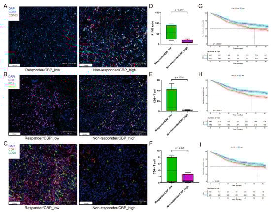 Immune infiltration analyses. (A–C) Detection of infiltrated macrophages, CD8+ T cells and CD4+ T cells in 4 responders/CBP_low and 4 non-responder/CBP_high to immunotherapy in the PKUCH cohort. (D–F) The M1/M2 ratio, CD8+ T cell proportion and CD4+ T cell proportion in 4 responders/CBP_low and 4 non-responders/CBP_high to immunotherapy. (G–I) Kaplan–Meier curves for the OS of GC patients in different groups classified by the median of CD68, CD8 and CD4 levels from a PKUCH cohort.
