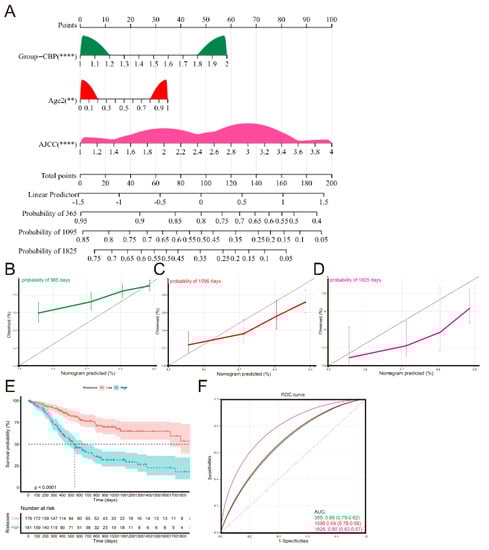 Since independent prognostic analyses found that the AJCC pathological stage, age and CBP signature were independent prognostic indicators for patients with GC, we established a nomogram to evaluate the probability of 1-, 3- and 5-year OS (Figure 9A). The calibration chart revealed that the predicted OS probability by the nomogram approximated the actual probability well, and the 3-year OS prediction best agreed with the actual OS (Figure 9B–D). The Kaplan–Meier curve analysis revealed that patients with higher nomogram scores had reduced OS (Figure 9E). Furthermore, the AUC at 1-, 3- and 5-year OS were 0.68, 0.69 and 0.80, respectively (Figure 9F), better than signal AJCC pathological stage, age and CBPscores.