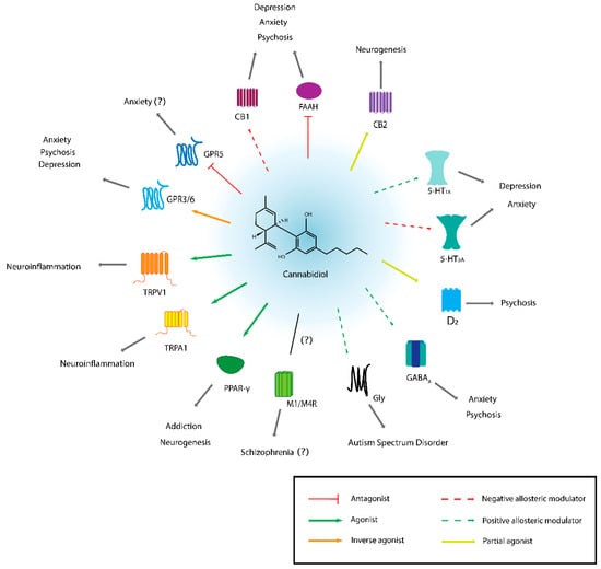 - Vitale, R.M.; Iannotti, F.A.; Amodeo, P. The (Poly)Pharmacology of Cannabidiol in Neurological and Neuropsychiatric Disorders: Molecular Mechanisms and Targets. Int. J. Mol. Sci. 2021, 22, 4876. [Google Scholar] [CrossRef]