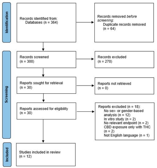 - The article included a sex- or gender-based analysis (no studies were identified that assessed the impact of the sociocultural construct of gender on CBD outcomes, so we focus only on sex moving forward). A study was considered to have a sex-based analysis when one of two conditions was met: (1) sex was analyzed as a main effect when the outcome of interest was CBD concentrations or pharmacokinetics (e.g., a t-test to determine if males and females differed in physiological concentrations of CBD); or (2) the study had a factorial design with sex as a factor that entered into an interaction term with a drug exposure or treatment factor (e.g., a two-way ANOVA to determine if there was an interaction between sex and CBD dose group on a relevant endpoint). This definition was based on previous literature describing appropriate reporting of sex differences [47,48].