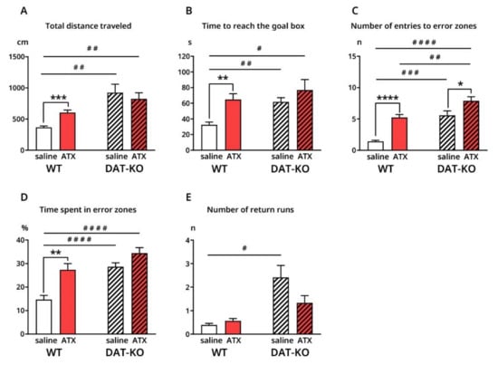 Behavioral characteristics of DAT-KO and WT rats after saline and ATX injections in Hebb–Williams maze (A–E). *, # p < 0.05; **, ## p < 0.01; ***, ### p < 0.001; ****, #### p < 0.0001; Brown–Forsythe and Welch ANOVA, Holm–Sidak’s multiple comparisons test.