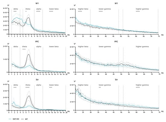 Power spectra and interareal coherence were evaluated in DAT-KO and WT rats after saline and ATX injections. After saline injections, significant differences in power were found in all three analyzed areas. The decreased power of DAT-KO brain activity compared to WT rats can be clearly seen in the theta range for all three areas (M1: p = 0.0327; PFC: p < 0.0001; Str: p < 0.0001) (Figure 4). Additionally, in M1 significant differences were found in the remaining bands, although in those cases power was increased in DAT-KO compared to WT (delta: p = 0.0026; alpha–higher gamma: p ≤ 0.0001) (Figure 4). In DAT-KO striatum, power was also higher than in WT in delta, lower beta and gamma + higher gamma ranges (delta and lower beta: p = 0.0006; lower gamma: p = 0.0063; higher gamma: p < 0.0001) (Figure 4).