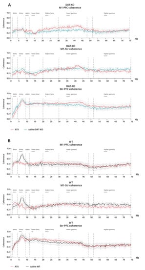 In WT rats, a significant decrease in coherence under ATX compared to saline can be seen in the theta range in all cases (p ≤ 0.0002) (Figure 7B). A decrease in coherence can also be observed throughout the whole gamma range in M1-Str (p < 0.0001), while in the delta band, there is an opposite effect (p < 0.0001) (Figure 7B). Finally, coherence is significantly increased in lower and higher beta bands both in M1-PFC and in PFC-Str under ATX when compared to saline (p ≤ 0.011) (Figure 7B).