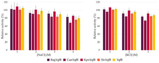 All tested YqfB analogues showed a very high salt tolerance and only a slight (~20%) decrease in activity at extreme concentrations of KCl and NaCl was observed. From all tested proteins, KpnYqfB and CunYqfB possessed the highest and lowest tolerance to high salt concentrations, respectively, although the differences did not reach statistical significance.