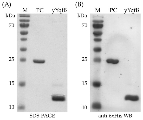 To investigate, whether part of the bacterial protein is glycosylated in the yeast expression system, a Western blot with concanavalin A (ConA) was performed. ConA is known as a lectin that specifically binds α-D-mannosyl and α-D-glucosyl groups, and is used to detect glycosylated proteins [20]. The results showed a similar band at ~15 kDa, while the main portion of the protein was ConA negative (Figure 4b). YqfB amino acid sequence analysis revealed a single position where N-glycosylation could occur—Asn76 (see Figure S6) [21].