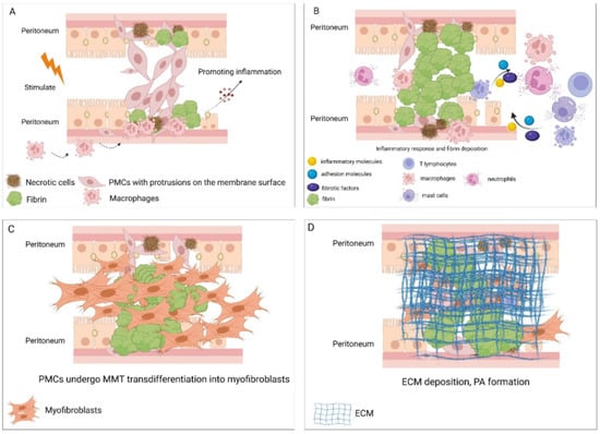 (A) Early stage of peritoneal adhesion (PA) formation: peritoneal mesothelial cells (PMCs) undergo shedding, necrosis, and phenotypic changes, form membrane protrusions, and fuse with each other to form early adhesions in the stimulated environment. (B) Intermediate stage of PA formation: PMCs initiate inflammatory responses by secreting inflammatory factors, adhesion molecules, and pro-fibrotic factors. Moreover, they are affected by the inflammatory environment, which stimulates them to further exacerbate the inflammatory process. At the same time, the fibrinolytic system is dysfunctional, causing excessive deposition of fibrin. (C) Late stage of PA formation: PMCs undergo mesothelial–mesenchymal transition (MMT) to form myofibroblasts. (D) Late stage of PA formation: myofibroblasts secrete a large amount of extracellular matrix to finally form a PA.
