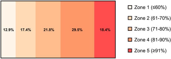 Average time spent in each training zone (%) over the 8-week high-intensity exercise training period (n = 13). The training zones were pre-defined by POLAR TEAM Pro. Zone 1 was ≤60% HRmax, Zone 2 was 61 to 70% HRmax, Zone 3 was 71 to 80% HRmax, Zone 4 was 81 to 90% HRmax, and Zone 5 was ≥91% HRmax (Polar Electro Oy, Kempele, Finland).